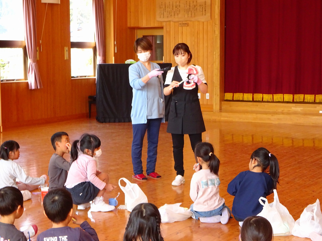 今日は歯科衛生士さんが来園し、年長さんが歯磨き指導をしていただきました。 |