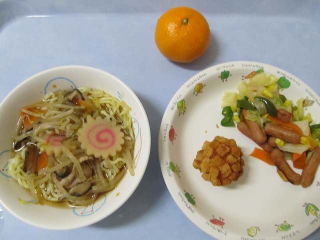 11月25日(金)給食 ・しょうゆラーメン ・鹿の子えび団子揚げ ・いろどりソテー ・みかん