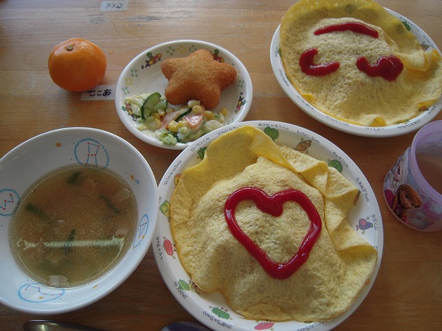 使用食材は、 ・オムライス(米・鶏肉・玉ねぎ・にんじん・卵) ・サラダ(キャベツ・きゅうり・にんじん・コーン) ・ABCスープ(マカロニ・ベーコン・玉ねぎ・ねぎ)