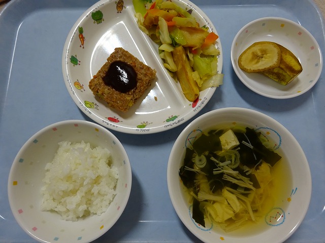 1月16日(月)給食 ・ごはん ・ミートローフ ・いろどりソテー ・すまし汁 ・バナナ