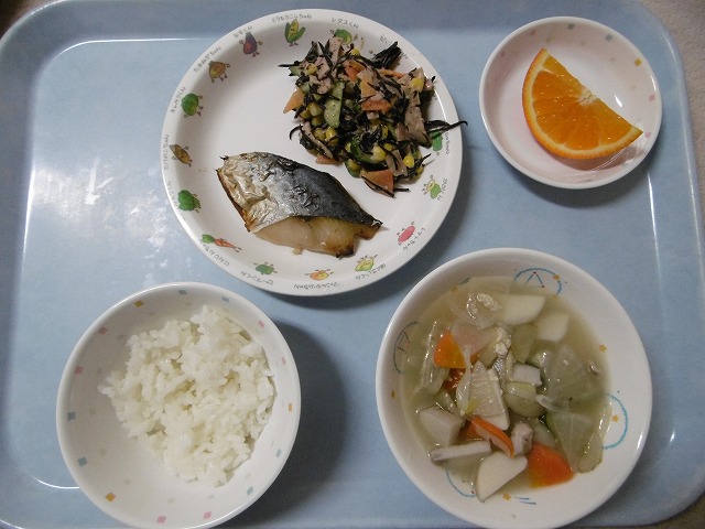 2月13日(火) 給食 ・ごはん ・さわらの照り焼き ・ひじきサラダ(ひじき・ハム・きゅうり・にんじん・コーン) ・けんちん汁(鶏肉・豆腐・油揚げ・だいこん・にんじん・ごぼう・さといも・ねぎ) ・オレンジ