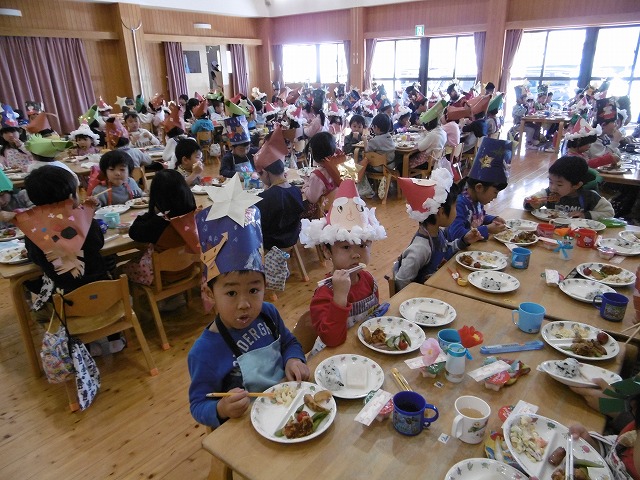 今日は、クリスマス会があり、給食は遊戯室での会食でした。 わかめおにぎりや鶏肉の唐揚げ、ウインナーなど子どもたちの好きなメニューでした。 みんなで、とても楽しい雰囲気で食べていました。