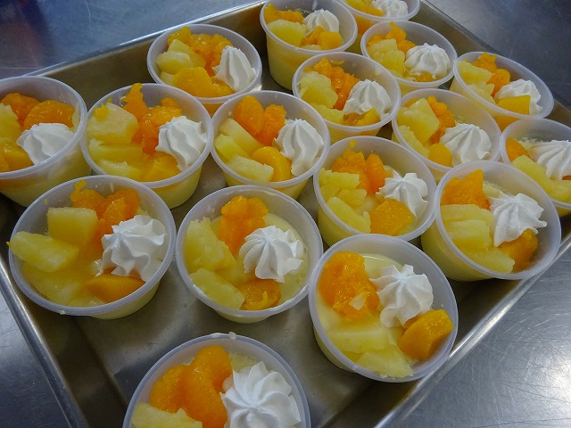 『パフェ』 プリンの素(卵未使用)に温めた牛乳を混ぜて、プリンを作りました。 みかん・パイン・もも缶を上にのせて、ホイップを飾りました。