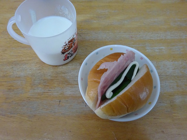 『サンドパン』 切り込みを入れたバターロールパンに、輪切りのきゅうりとスライスハムをはさみ、 マヨドレを入れました。 以上児は、各自のお皿にパンときゅうり、ハムをもらい、自分で挟みました。 大きく口を開けて、楽しそうに食べていました。