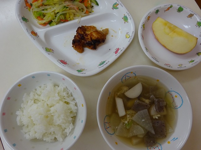11月20日(水)給食 ・ごはん ・鶏肉のごまみそ焼き(鶏肉・ごま・みそ) ・マロニーの中華あえ(マロニー・キャベツ・きゅうり・にんじん・かにかま) ・のっぺい汁(さといも・だいこん・油揚げ・こんにゃく・ねぎ) ・りんご