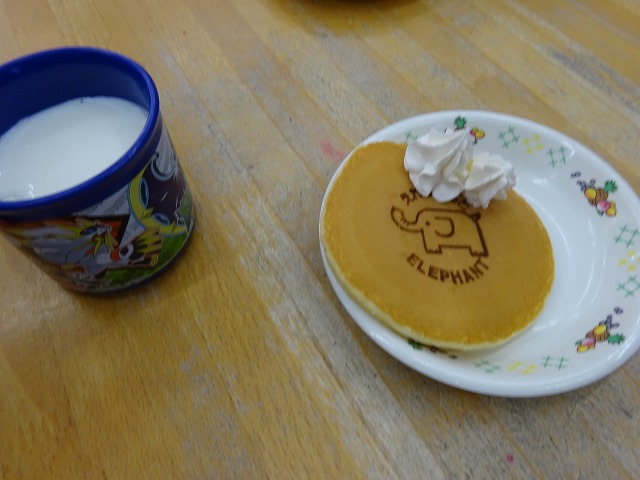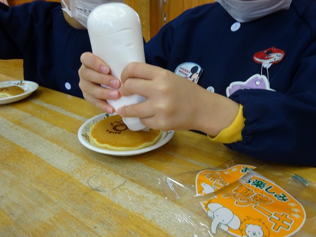 今日のおやつは、 自分たちで、ホットケーキにホイップクリームを飾りました。