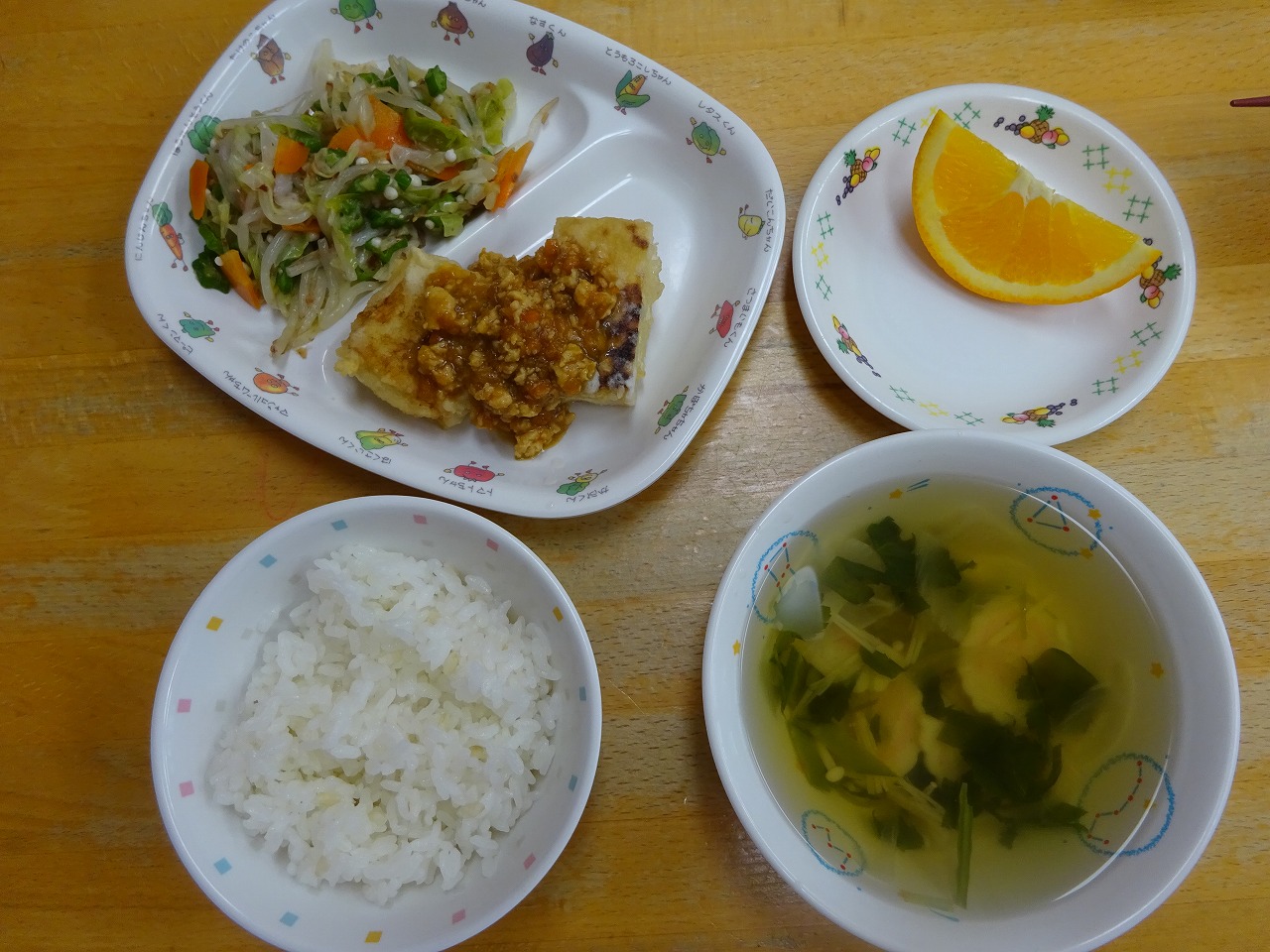 7月15日(水)給食 ・ごはん ・焼き豆腐の鶏みそかけ(焼き豆腐・鶏ひき肉・玉ねぎ・にんじん・みそ) ・オクラのおかかあえ(オクラ・キャベツ・にんじん・もやし・かつお節) ・すまし汁(玉ねぎ・えのきたけ・なると・みつば) ・オレンジ 今日のおやつは、『キャロットケーキ』 でした。
