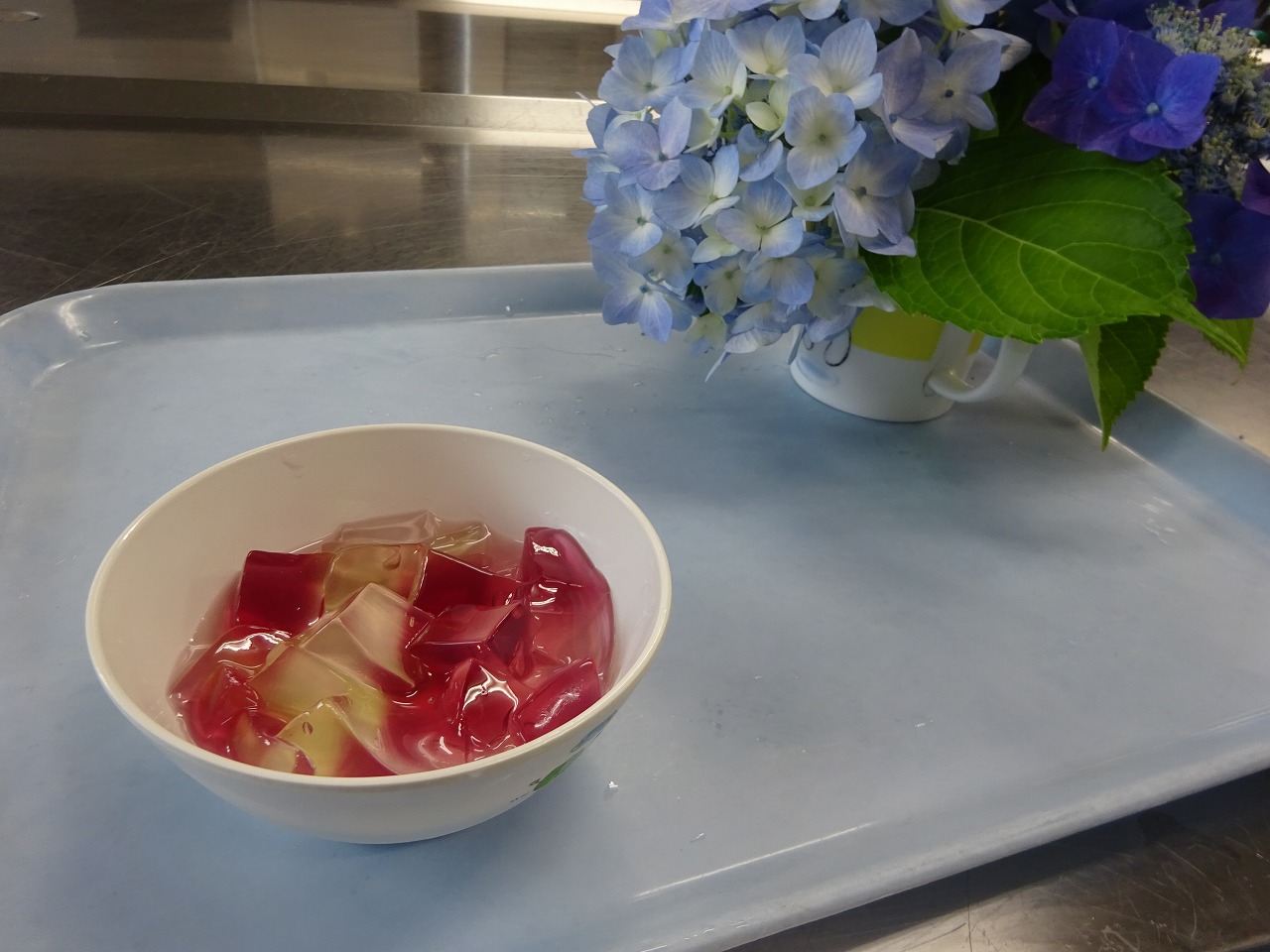 今日のおやつは、あじさいゼリーでした。 赤やピンク色のあじさいを思いながら、ゼリーの素でグレープ・ピーチ・ストロベリーのゼリーと、透明と黄緑のゼリーも加えて、きれいなおやつができました。