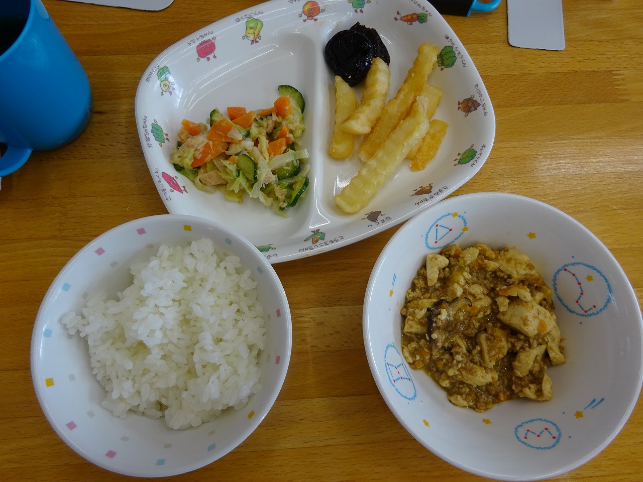 9月1日(水)給食 と おやつ ・ごはん ・マーボー豆腐(豆腐・豚挽肉・ねぎ・にんじん・干ししいたけ) ・キャベツのサラダ(キャベツ・きゅうり・にんじん・ツナ) ・フライドポテト ・プルーン 今日のおやつは、かんパン