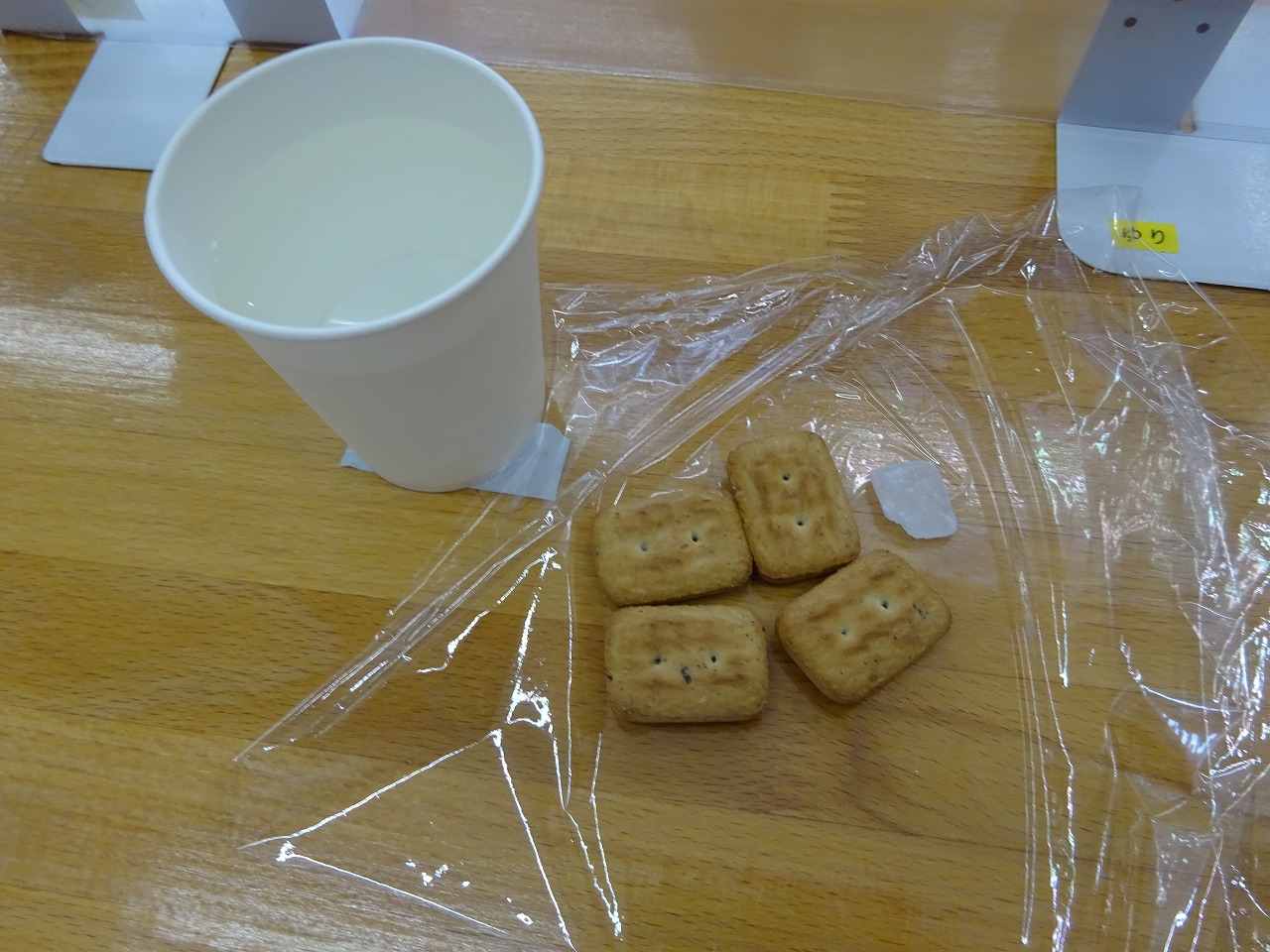 9月1日は、防災の日です。 おやつは、非常時のために備蓄している、水とかんパンです。 園児たちはいつもと違うおやつで、保育士から災害時の話を真剣に聞いてました。