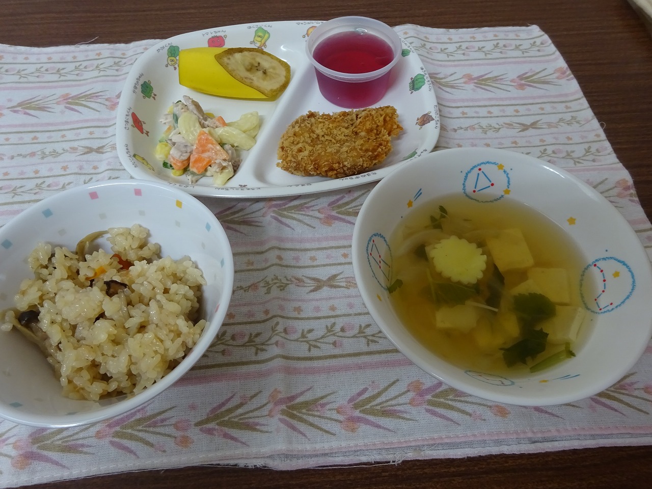 9月30日(月)給食:誕生会メニュー ・五目ごはん ・ヒレカツ ・マカロニサラダ ・すまし汁 ・バナナ(※今月の誕生児のみ手作りゼリーがつきます。)