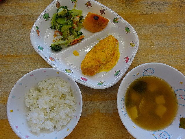 11月12日(火)給食 ・ごはん ・スペイン風オムレツ(卵・ベーコン・じゃがいも・ピーマン・トマト・玉ねぎ・コーン) ・グリーンサラダ(キャベツ・きゅうり・ブロッコリー・ツナ) ・みそ汁(豆腐・油揚げ・しめじ・にんじん・ねぎ・みそ) ・りんご