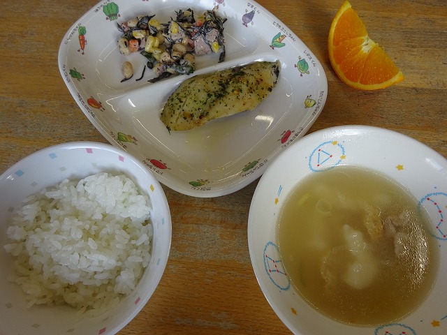 11月13日(水)給食 ・ごはん ・さわらの香草焼き(さわら・にんにく・パセリ・オリーブ油) ・かみかみサラダ(大豆・ハム・ひじき・きゅうり・にんじん・コーン・マヨドレ・みそ) ・すいとん汁(豚肉・油揚げ・かまぼこ・ねぎ・小麦粉・スキムミルク・白玉粉) ・オレンジ