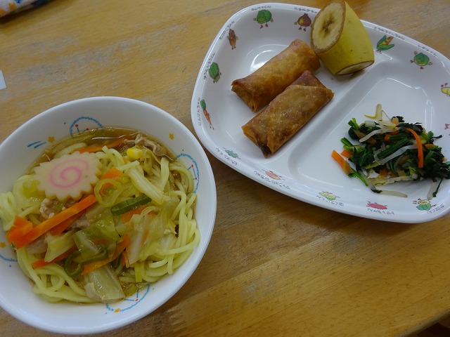 11月15日(金)給食 と おやつ ・みそラーメン(麺・豚肉・キャベツ・なると・にんじん・コーン・ねぎ・みそ) ・いそかあえ(ほうれん草・はくさい・もやし・にんじん・焼のり) ・ミニはるまき ・バナナ 今日のおやつは、『サンドパン』