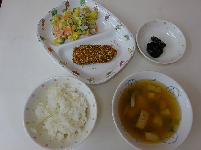 11月19日(火)給食 ・ごはん ・さんまのごま揚げ ・さつま芋のサラダ(さつまいも・きゅうり・にんじん・ハム・コーン・マヨドレ) ・みそ汁(豆腐・油揚げ・こまつな・しめじ・ねぎ・みそ) ・プルーン