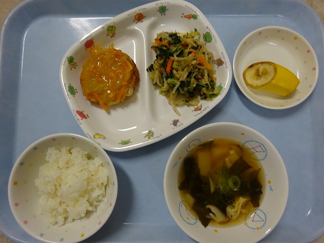 8月30日(金)給食 & おやつ ・ごはん ・豆腐ハンバーグ野菜あんかけ(豆腐ハンバーグ・玉ねぎ・にんじん) ・ほうれん草おかかあえ(ほうれん草・キャベツ・にんじん・もやし) ・みそ汁(じゃがいも・油揚げ・しいたけ・ねぎ・わかめ・みそ) ・バナナ 〈おやつ〉今月のベジおやつ おかずパン(コーンとパセリ入りです。)