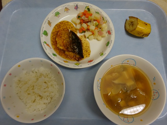 9月3日(火)給食 ・ごはん ・さばのごまだれかけ(さば・ごま) ・コロコロポテトサラダ(じゃがいも・ハム・きゅうり・玉ねぎ・にんじん) ・みそ汁(豆腐・油揚げ・キャベツ・しいたけ・ねぎ) ・バナナ