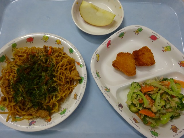 9月4日(水)給食 ・焼きそば(麺・豚肉・キャベツ・玉ねぎ・にんじん・ピーマン) ・ブロッコリーサラダ(ブロッコリー・ツナ・きゅうり・にんじん) ・いかの厚切りフライ ・りんご