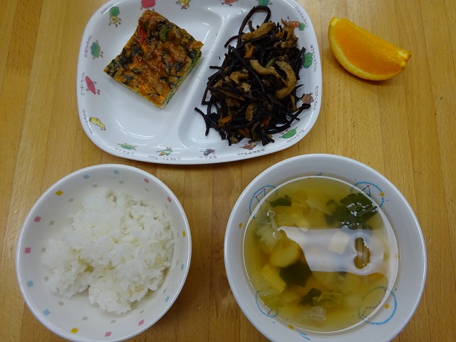 9月5日(木)給食 ・ごはん ・千草焼き(卵・ほうれん草・にんじん・かにかま・干ししいたけ) ・ひじきの煮物(ひじき・油揚げ・ちくわ・にんじん・いんげん) ・すまし汁(豆腐・ふ・はくさい・たまねぎ・みつば) ・オレンジ