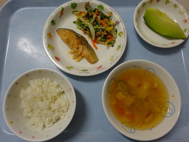 7月11日(木)給食 ・ごはん ・鮭の西京漬焼き ・ほうれん草ナムル(ほうれん草・キャベツ・もやし・にんじん・コーン) ・みそ汁(豆腐・油揚げ・大根・にんじん・ねぎ・みそ) ・メロン