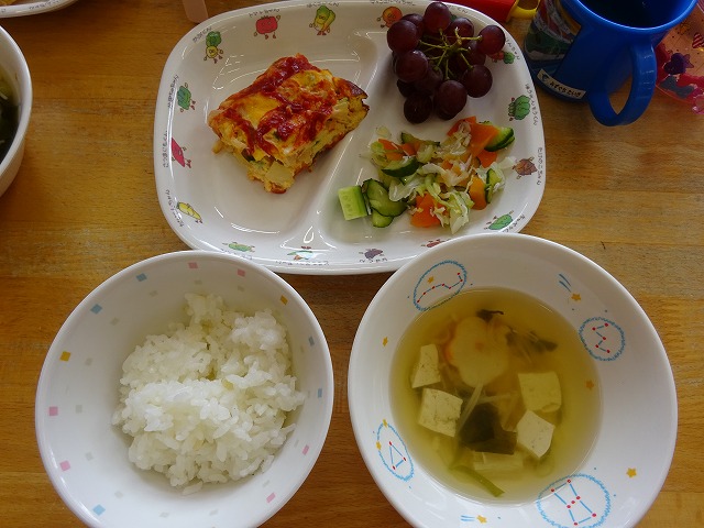7月12日(金)給食 ・ごはん ・スペイン風オムレツ(卵・ベーコン・じゃがいも・ピーマン・トマト・玉ねぎ・ケチャップ) ・キャベツの甘酢あえ(キャベツ・きゅうり・にんじん・しらす干し) ・すまし汁(豆腐・麩・えのきたけ・ねぎ・わかめ) ・ぶどう