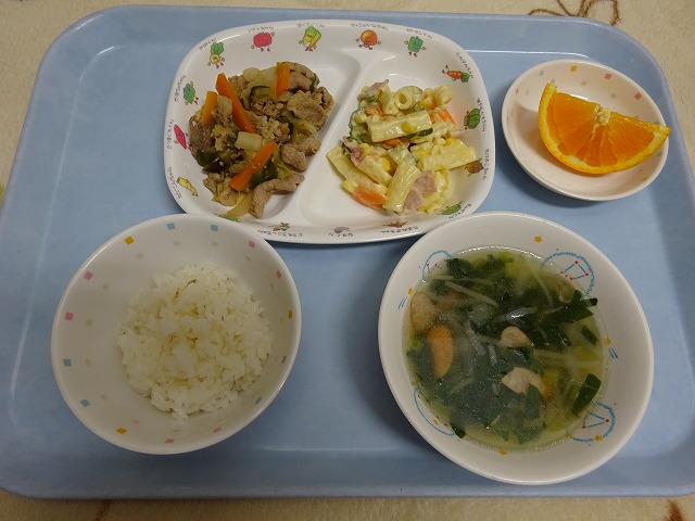 7月16日(火)給食 ・ごはん ・豚肉となすのみそ炒め(豚肉・なす・玉ねぎ・キャベツ・にんじん・ピーマン・みそ) ・マカロニサラダ(マカロニ・きゅうり・にんじん・コーン・ハム・マヨ) ・もやしスープ(もやし・ウインナー・玉ねぎ・こまつな) ・オレンジ