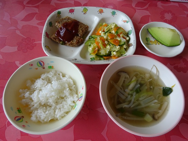 7月26日(金)給食 ・ごはん ・ミートローフ(合挽肉・玉ねぎ・にんじん・グリンピース・卵・パン粉・牛乳・ケチャップ) ・チーズサラダ(チーズ・キャベツ・きゅうり・にんじん) ・コンソメスープ(チンゲン菜・玉ねぎ・しめじ・もやし・ねぎ) ・メロン