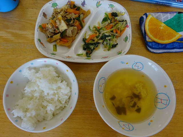 7月29日(月)給食 ・ごはん ・厚揚げの中華煮(厚揚げ・豚肉・玉ねぎ・にんじん・にら・干ししいたけ) ・ほうれん草のごまあえ(ほうれん草・キャベツ・にんじん・もやし・ごま) ・すまし汁(油揚げ・かまぼこ・えのきたけ・ねぎ・わかめ) ・オレンジ