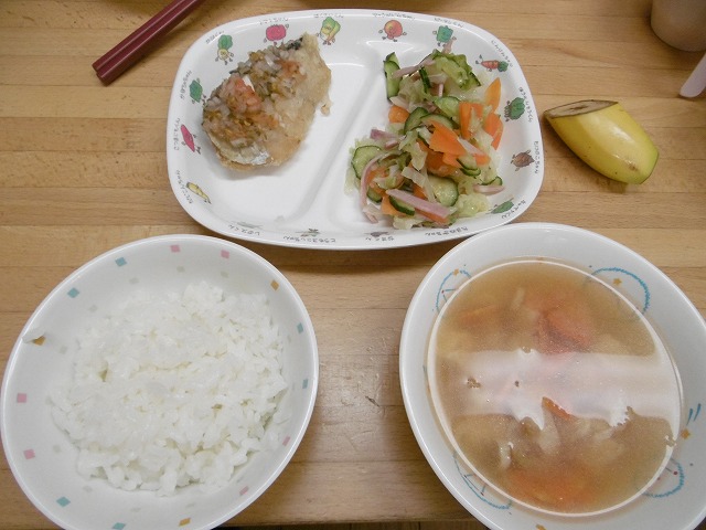 7月30日(火)給食 ・ごはん ・魚のエスカベッシュ(さわら・玉ねぎ・トマト・パセリ) ・ハムサラダ(キャベツ・きゅうり・にんじん・ハム) ・みそ汁(豆腐・油揚げ・じゃがいも・にんじん・ねぎ・みそ) ・バナナ