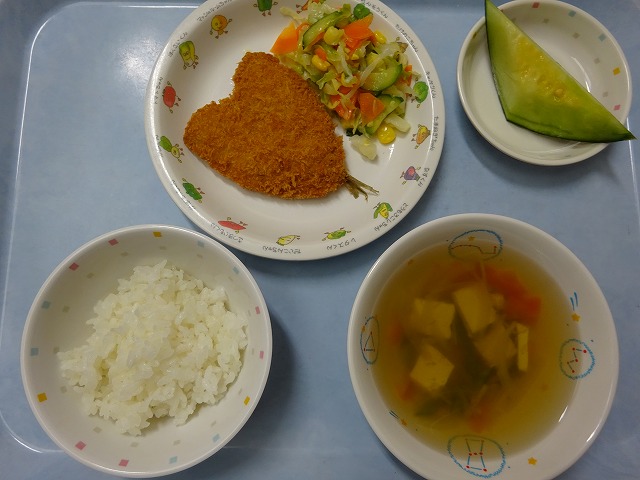 6月11日(火)給食 ・ごはん ・あじフライ ・フレンチサラダ(キャベツ・きゅうり・にんじん・コーン) ・すまし汁(豆腐・玉ねぎ・えのきたけ・にんじん・さやえんどう) ・メロン