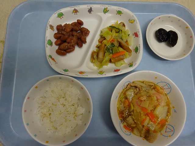 6月13日(木)給食 ・ごはん ・八宝菜(豚肉・えび・いか・白菜・にんじん・なると・玉ねぎ・たけのこ・干ししいたけ) ・三色ソテー(ウインナー・キャベツ・玉ねぎ・ピーマン・にんじん) ・金時豆の甘煮 ・プルーン