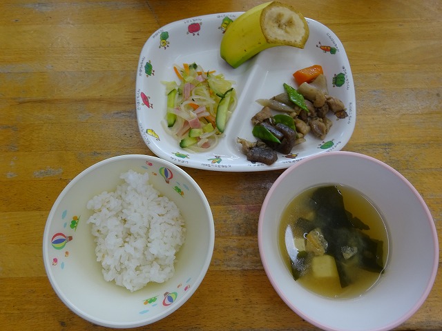 6月14日(金)給食 ・ごはん ・筑前煮(鶏肉・にんじん・ごぼう・こんにゃく・えんどう・干ししいたけ) ・マロニーの中華あえ(マロニー・ハム・キャベツ・きゅうり・にんじん) ・みそ汁(豆腐・油揚げ・玉ねぎ・わかめ・みそ) ・バナナ