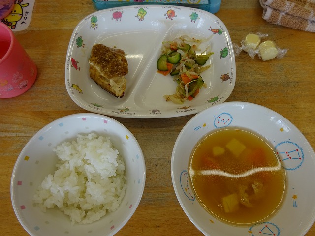 6月20日(木)給食 ・ごはん ・さばのごまだれかけ ・キャベツの梅かつおあえ(キャベツ・きゅうり・にんじん・うめびしお・かつお節) ・みそ汁(豆腐・油揚げ・だいこん・にんじん・ねぎ・みそ) ・チーズ