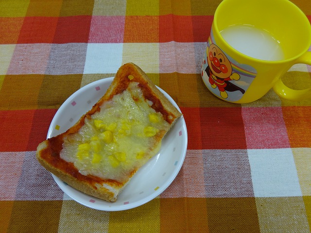 6月21日(金)給食 ・ おやつ ・和風スパゲティ(麺・ツナ・玉ねぎ・にんじん・えのきたけ・しめじ・ピーマン・のり) ・チップスサラダ(ポテトチップス・キャベツ・きゅうり・にんじん) ・ミートボール ・パイナップル おやつ『ピザトースト』 今月のベジおやつとして、ピザトーストに玉ねぎとコーンを使いました。 ピーマンやトマトをのせてもいいですね。