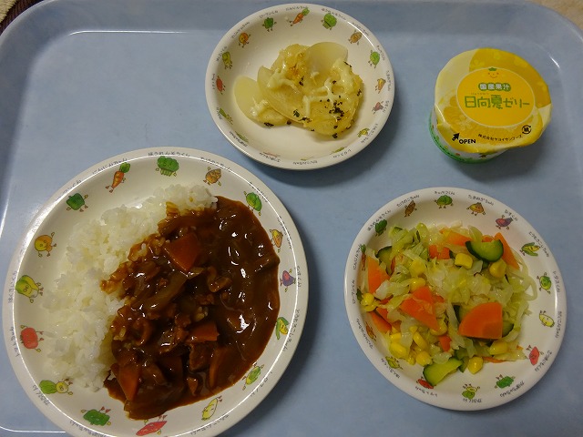 6月24日(月)給食 ・ハヤシライス(米・豚肉・玉ねぎ・にんじん・マッシュルーム) ・コーンサラダ(キャベツ・きゅうり・にんじん・コーン) ・じゃが芋のオーブン焼き(じゃがいも・マヨドレ・パセリ) ・日向夏ゼリー