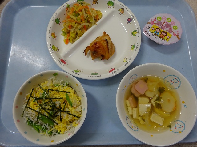 3月1日(金)給食 ・ちらし寿司(米・にんじん・れんこん・しらす干し・卵・さやえんどう・のり) ・鶏肉の照り焼き ・白菜のごまあえ(白菜・キャベツ・にんじん・もやし・ごあm) ・すまし汁(豆腐・かまぼこ・たまねぎ・ふ・みつば) ・ひなまつり桃の花ゼリー