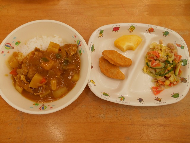 3月4日(月)給食 ・カレーライス(米・豚肉・じゃがいも・にんじん・玉ねぎ・ピーマン) ・キャベツサラダ(キャベツ・ツナ・きゅうり・にんじん・コーン) ・チキンナゲット ・パイナップル