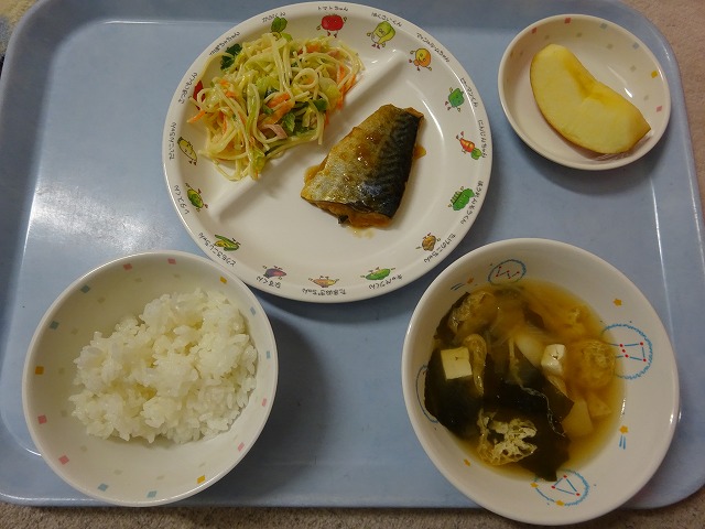 3月5日(火)給食 ・ごはん ・さばのみそ煮 ・スパサラダ(キャベツ・きゅうり・にんじん・サラスパ) ・みそ汁(豆腐・油揚げ・さといも・玉ねぎ・わかめ・みそ) ・りんご