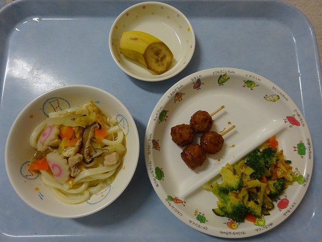3月7日(木) 給食 ・煮込みうどん(うどん・鶏肉・なると・油揚げ・はくさい・にんじん・ねぎ) ・ブロッコリーおかかあえ(ブロッコリー・キャベツ・きゅうり・にんじん・かつお節) ・つくね串 ・バナナ