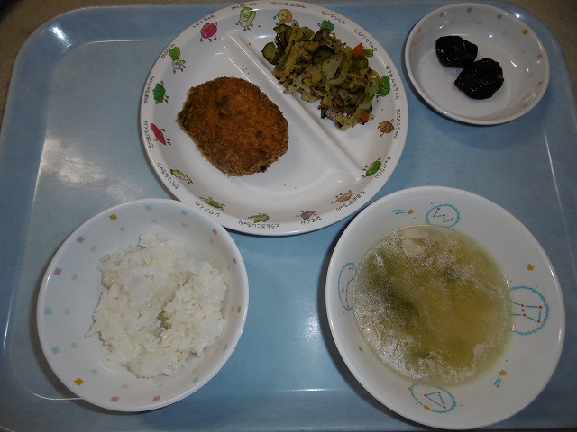3月8日(金)給食 ・ごはん ・手作りコロッケ(豚挽肉・じゃがいも・玉ねぎ・にんじん・卵・パン粉) ・キャベツのゆかりああえ(キャベツ・きゅうり・にんじん・ゆかり) ・ABCスープ(マカロニ・ベーコン・チンゲン菜・もやし・ねぎ) ・プルーン
