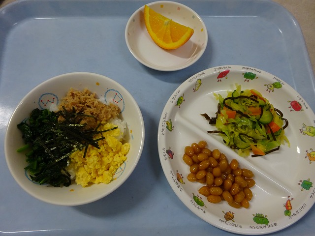 3月11日(月)給食 ・三色どんぶり(米・ツナ・卵・ほうれん草・のり) ・キャベツの塩昆布あえ(キャベツ・きゅうり・にんじん・塩昆布) ・大豆の甘煮 ・オレンジ