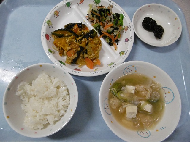 12月20日(木)給食 ・ごはん ・かぼちゃの中華風煮(かぼちゃ・鶏挽き肉・玉ねぎ・にんじん・ピーマン) ・いそかあえ(こまつな・キャベツ・もやし・にんじん・のり) ・みそ汁(豆腐・油揚げ・だいこん・ねぎ・わかめ・みそ) ・プルーン