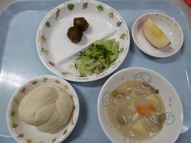 12月25日(火)給食 ・ロールパン ・クリームシチュー(鶏肉・じゃがいも・玉ねぎ・にんじん・マッシュルーム) ・グリーンサラダ(ブロッコリー・キャベツ・きゅうり) ・ミートボール ・りんご