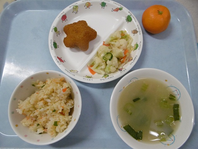 12月27日(木)給食 ・えびチャーハン(米・えび・玉ねぎ・ピーマン・にんじん) ・星のコロッケ ・カリフラワーサラダ(カリフワラー・キャベツ・にんじん・きゅうり) ・コーンスープ(コーン・玉ねぎ・チンゲン菜) ・みかん