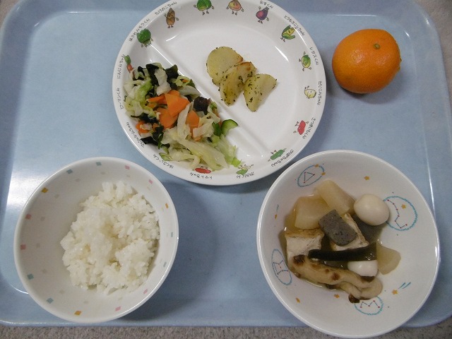 1月9日(水)給食 ・ごはん ・関東煮(だいこん・厚揚げ・うずら卵・ちくわ・こんにゃく) ・海藻サラダ(海藻・キャベツ・きゅうり・にんじん) ・じゃがいもオーブン焼き(じゃがいも・バター・パセリ) ・みかん