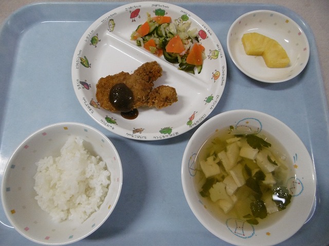 11月27日(火) 給食 ・ごはん ・みそカツ(豚肉) ・キャベツの香り漬け(キャベツ・きゅうり・にんじん・ごま) ・すまし汁(豆腐・かまぼこ・玉ねぎ・みつば) ・パイナップル