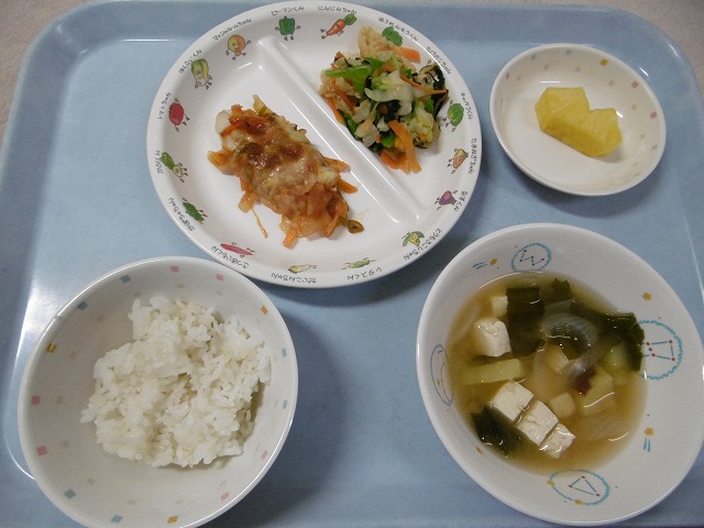 12月4日(火)給食 ・ごはん ・魚のピザ風焼き(メルルーサ・玉ねぎ・ピーマン・にんじん・チーズ) ・こまつなの和え物(こまつな・白菜・にんじん・油揚げ) ・みそ汁(さつまいも・豆腐・玉ねぎ・わかめ・みそ) ・パイナップル