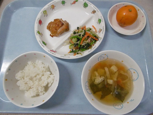 12月11日(火)給食 ・ごはん ・鶏肉の香味焼き(鶏肉・にんにく・ごま油) ・かわりおひたし(ほうれん草・ツナ・キャベツ・にんじん・もやし) ・みそ汁(豆腐・油揚げ・玉ねぎ・にんじん・わかめ・みそ) ・みかん