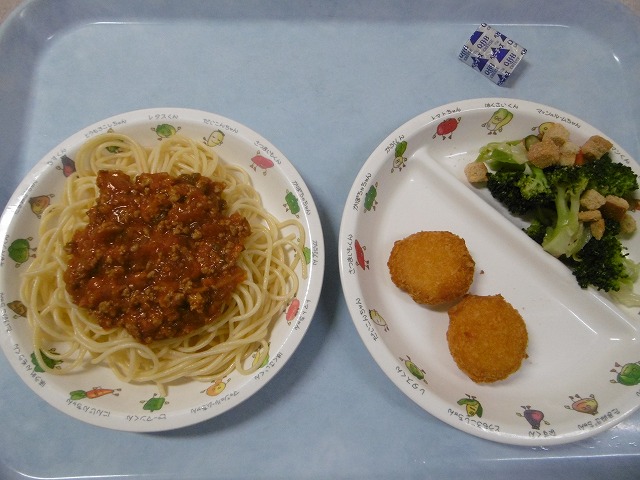 12月13日(木)給食 ・ミートスパゲティ(スパゲティ・合挽肉・玉ねぎ・にんじん・ピーマン・粉チーズ) ・クルトンサラダ(クルトン・キャベツ・きゅうり・にんじん・ブロッコリー) ・ほたて風フライ ・チーズ