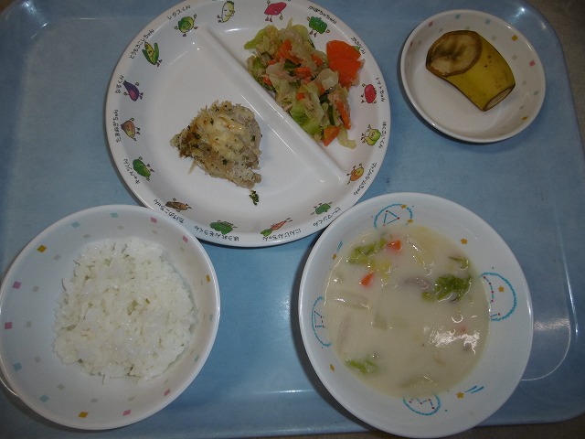 10月18日(木)給食 ・ごはん ・鶏肉のパン粉焼き(鶏肉・マヨドレ・パン粉・パセリ) ・ツナサラダ(ツナ・キャベツ・きゅうり・にんじん) ・白菜のクリーム煮(はくさい・ベーコン・玉ねぎ・にんじん・しめじ・牛乳) ・バナナ